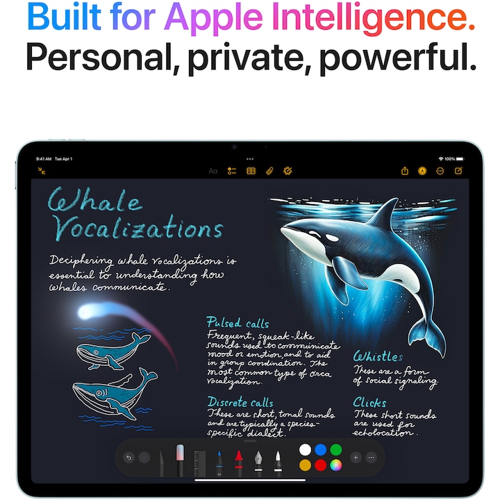iPad Air este creat pentru Apple Intelligence, functia de inteligenta personala care te ajuta sa te exprimi si sa rezolvi tot ce ai de facut, fara efort. Datorita unui sistem revolutionar de protectie a confidentialitatii, poti fi relaxat stiind ca datele tale nu mai pot fi accesate de nimeni altcineva. Nici chiar de Apple.