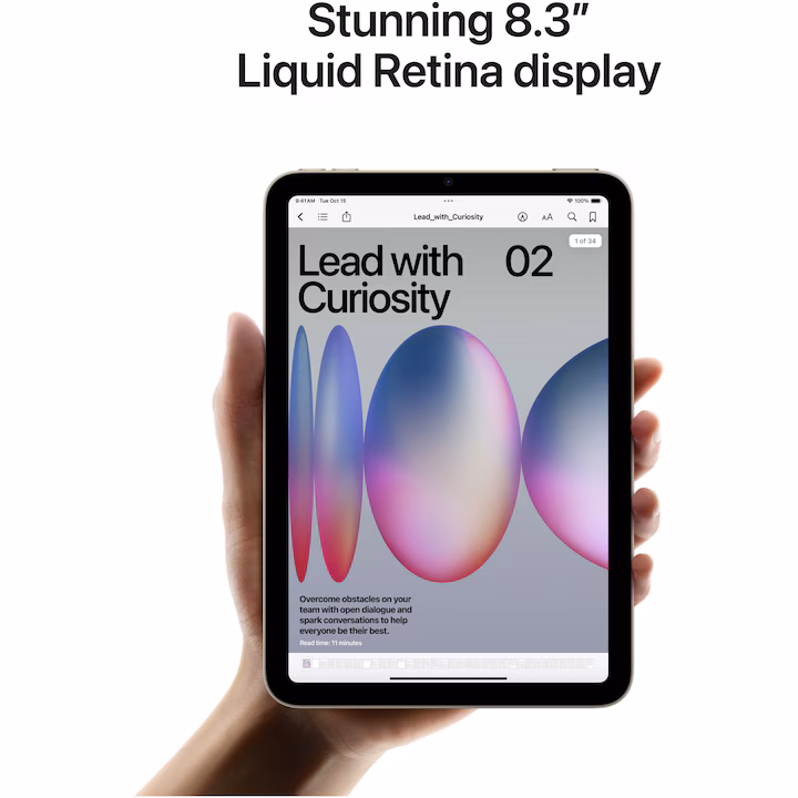 Ecranul Liquid Retina de 8,3 inchi este dotat cu True Tone, gama cromatica larga P3 si grad de reflexie foarte mic. Totul, pentru a-ti livra text clar si culori intense, oriunde te-ai afla.
