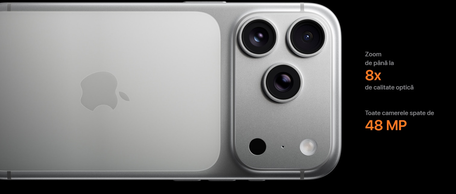 In sistemul de camere al modelului iPhone 17 Pro vei descoperi elemente de inovatie care fac o mare diferenta. Teleobiectivul dispune de noua generatie de design cu tetraprisma si un senzor cu 56% mai mare. Cu o distanta focala echivalenta cu 200 mm, zoom-ul 8x de calitate optica reprezinta cel mai lung teleobiectiv al unui iPhone de pana acum — oferind un interval total de zoom optic de 16x. Pentru ca tu sa poti explora o gama si mai variata de optiuni creative si sa conferi mai multa profunzime compozitiilor tale.