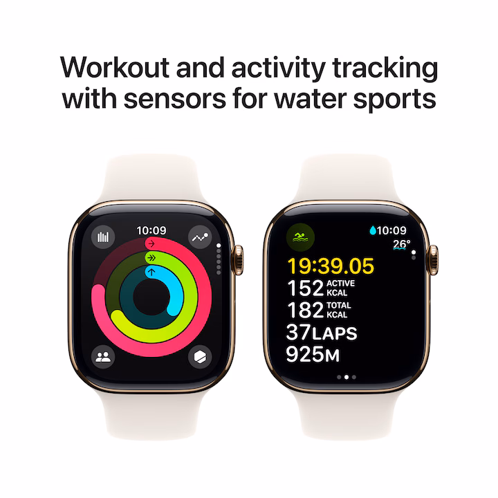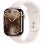 Apple Watch 10, GPS, Cellular, Carcasa Gold Titanium 46mm, Starlight Sport Band – S/M