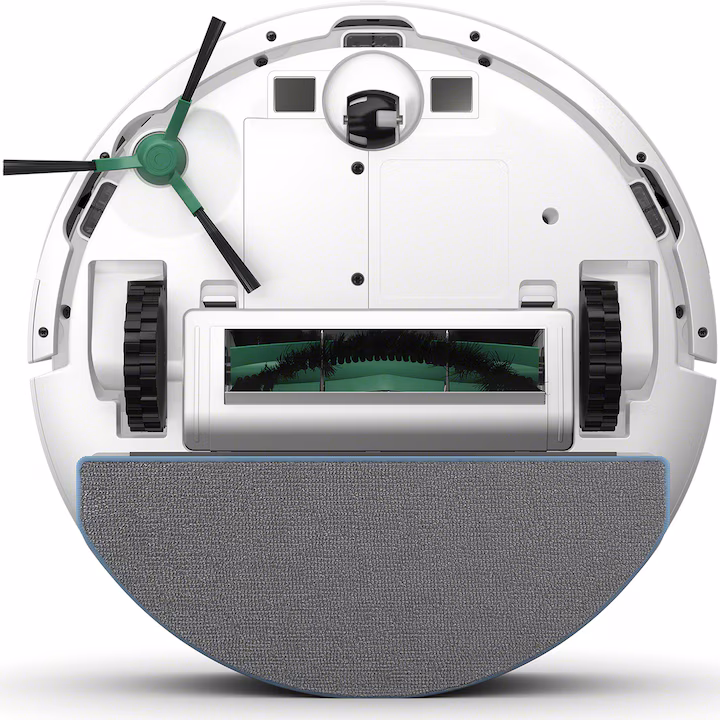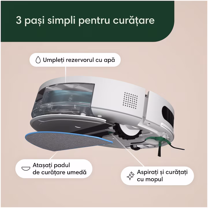 Pentru a folosi functia de mop, tot ce trebuie sa faceti este sa umpleti rezervorul de apa al robotului si sa il atasati robotului, si sa pozitionati laveta de stergere. Indepartati covoarele din calea robotului pentru ca podele dvs sa se bucure de aspirare si stergere cu o singura trecere a robotului.