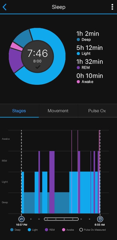 Somnul este important pentru starea dvs. generala de sanatate si de bine, cat si pentru performantele fizice. Pentru a va face o idee despre modul in care dormiti, vívosmart 4 monitorizeaza fazele de somn usor, profund si REM, impreuna cu miscarea pe parcursul noptii. Pentru informatii suplimentare, activati functia Pulse Ox pentru a verifica nivelul de oxigen din sange in timpul somnului. La trezire, puteti verifica usor si compara statisticile legate de somn in aplicatia mobila Garmin Connect™. |