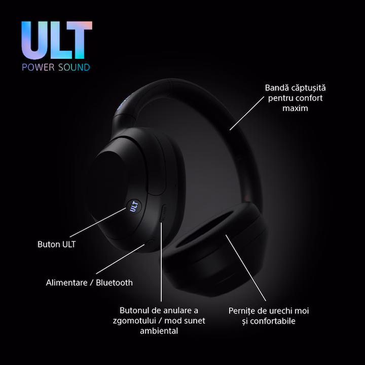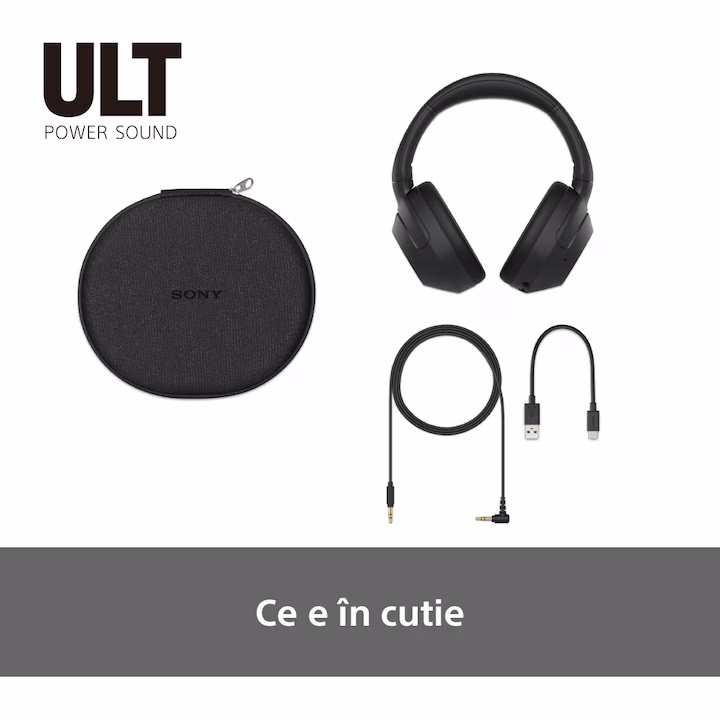 Casti Over the Ear Sony ULT WEAR, Wireless, Bluetooth, ULT Power Sound, Noise cancelling, Autonomie baterie 30 ore, Microfon, IOS si Android, Negru