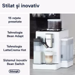 Espressor automat De’Longhi Rivelia EXAM440.55.W, 0132215473, 1450W, 18 tipuri de bauturi, 19 bari, 2 recipiente pentru boabe, Tehnologie Bean Adapt, Carafa de lapte cu tehnologie LatteCrema Hot, Alb