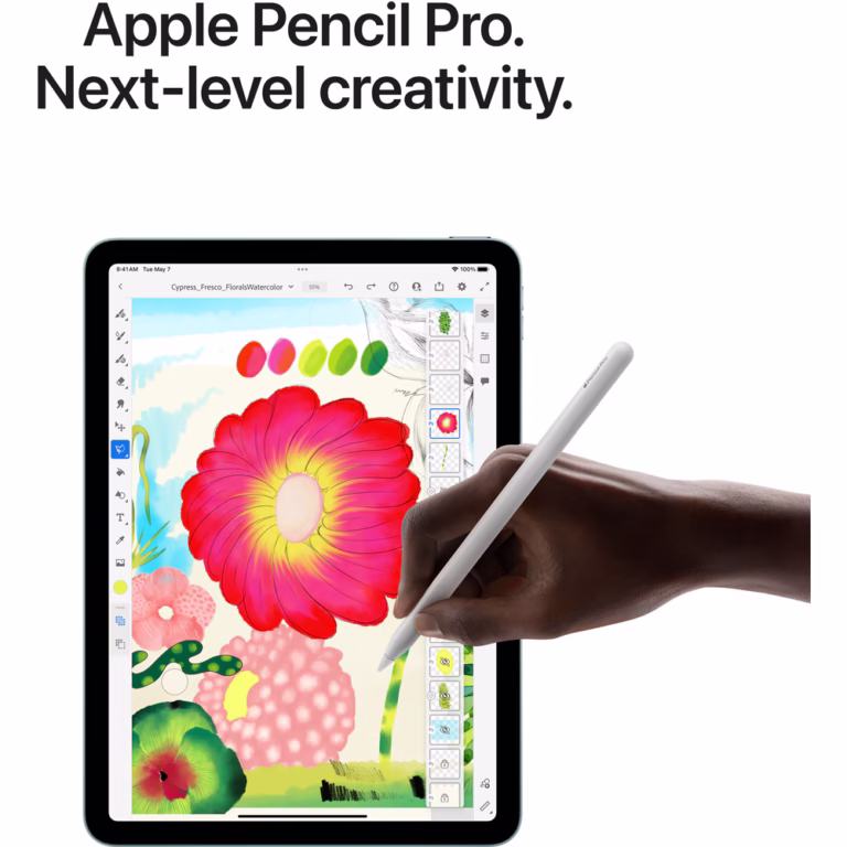 Apple Pencil Pro transforma iPad Air intr-o panza captivanta de desen sau pictura si un dispozitiv de luat notite. Apple Pencil (USB-C) este compatibil si cu iPad Air. Apple Pencil Pro se vinde separat!